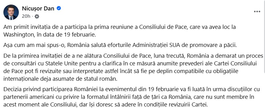 „Am primit invitația de a participa la prima reuniune a Consiliului de Pace, care va avea loc la Washington, în data de 19 februarie. Așa cum am mai spus-o, România salută eforturile Administrației SUA de promovare a păcii. De la primirea invitației de a ne alătura Consiliului de Pace, luna trecută, România a demarat un proces de consultări cu Statele Unite pentru a clarifica în ce măsură anumite prevederi ale Cartei Consiliului de Pace pot fi revizuite sau interpretate astfel încât să fie pe deplin compatibile cu obligațiile internaționale deja asumate de statul român. Decizia privind participarea României la evenimentul din 19 februarie va fi luată în urma discuțiilor cu partenerii americani cu privire la formatul întâlnirii față de țări ca România, care nu sunt membre în acest moment ale Consiliului, dar își doresc să adere în condițiile revizuirii Cartei.”
